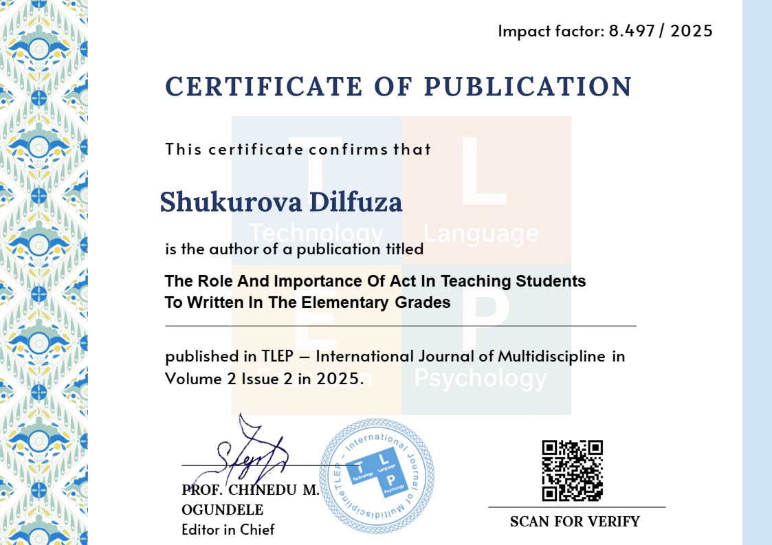 Mirzayeva, G. A., & Tursunov, I. R. (2021). Boshlang‘ich sinflarda yozishni o‘rgatishda interaktiv texnologiyalarning ahamiyati. Pedagogika ilm-fani, 4(1), 67–73.