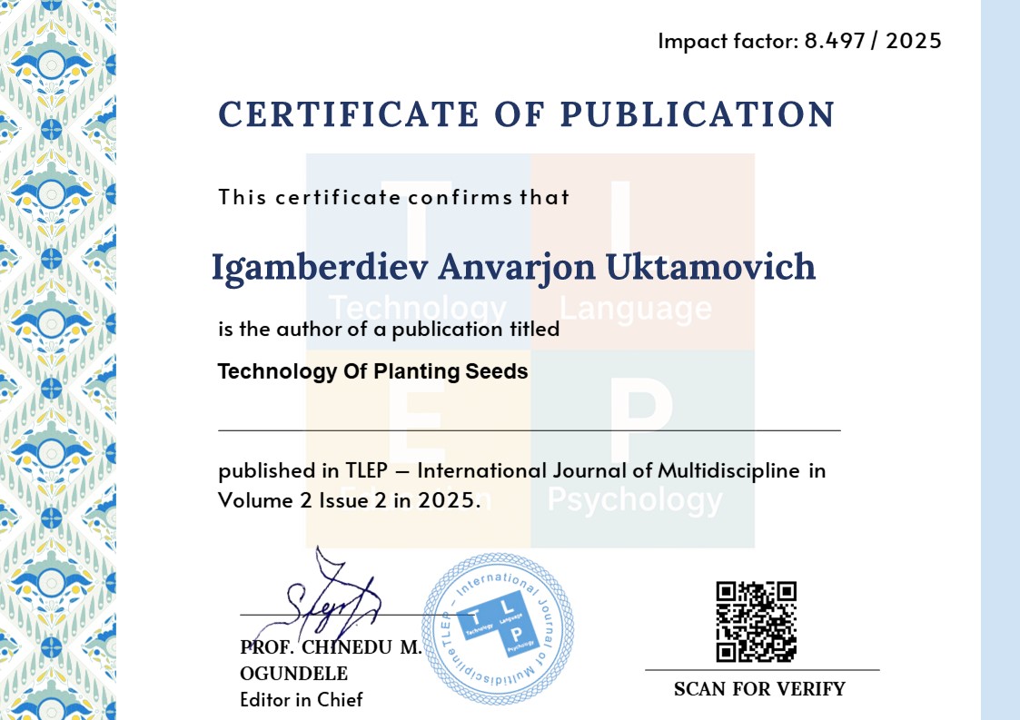 Игамбердиев А., Бурхонов З. Ерларга ишлов беришда қўлланиладиган комбинациялашган агрегат ва унинг афзалликлари// АндМИ. Машинасозлик илмий-техника журнали, № 2, 2022 йил.