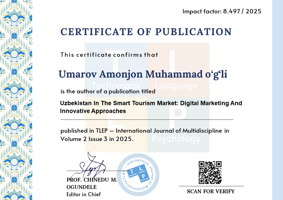 The article concludes with a summary of the main conclusions and specific strategies for promoting Uzbekistan’s smart tourism potential in the global market. The research results are of practical importance for policymakers, industry experts, and academics.