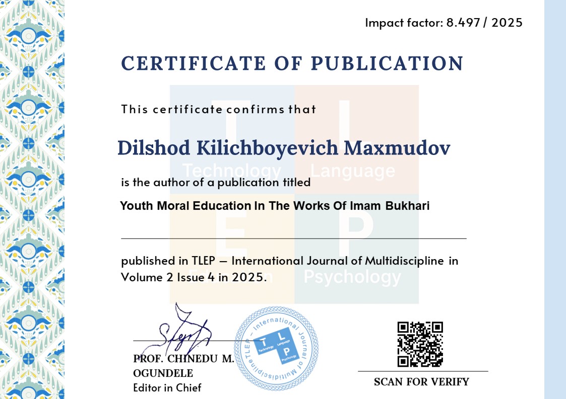 This paper analyzes the issues of moral and spiritual education of youth based on Imam Bukhari’s works, Sahih al-Bukhari and Al-Adab al-Mufrad. The study examines the educational role of the family, the impact of lawful sustenance (halal rizq) on morality, and the significance of raising girls in a contemporary context. Additionally, the relevance of Imam Bukhari’s legacy in countering the negative influence of Western culture on youth spirituality is discussed.