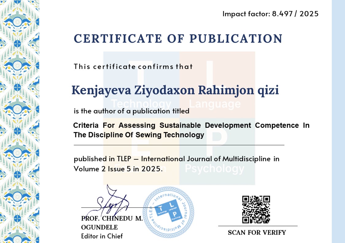 The article analyzes the criteria for the formation and assessment of sustainable development competencies in students in the field of sewing technology. The author studies the components of competencies - knowledge, skills, attitudes and values. The diagnostic methods used in the assessment process, the assessment table and indicators determining the level of ecological thinking are justified. The article also provides recommendations for the development of ecological competencies in vocational education within the framework of the sustainable development strategy of Uzbekistan.