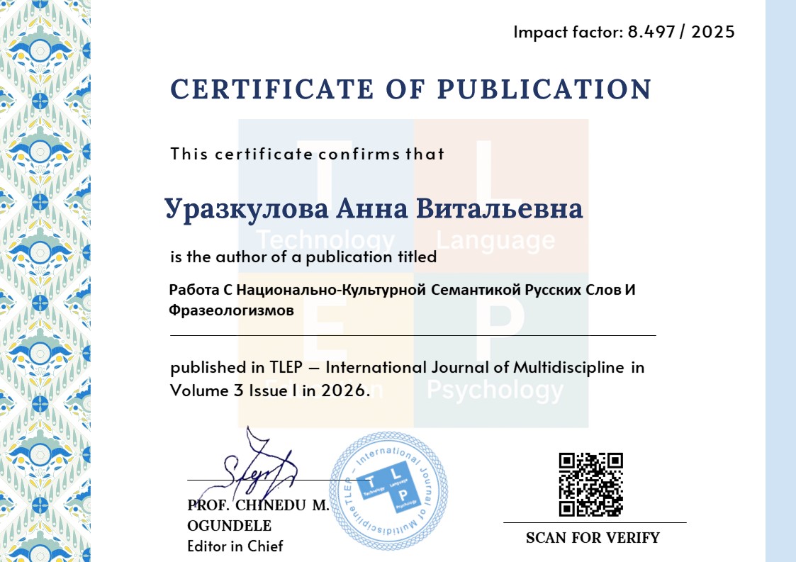 Практическая значимость работы заключается в возможности применения полученных данных при преподавании русского языка как иностранного, разработке учебных материалов и формировании межкультурной компетенции обучающихся. Данное исследование способствует более глубокому пониманию механизма интеграции языковых единиц и культурных реалий, а также подчеркивает важность учета национально-культурной семантики в лингвистических исследованиях.