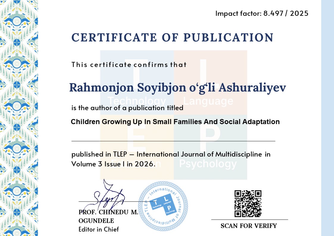 This study investigates the social adaptation of children raised in small families, with a focus on their social skills, emotional development, and peer relationships. As family sizes continue to decrease worldwide, understanding how this shift affects child development has become increasingly important. Using survey data collected from 300 students aged 10–15, this research compares children from small families (one or two children) with those from larger families (three or more children). A standardized social adaptation scale was employed to measure peer interaction, emotional regulation, school adjustment, and self-confidence.