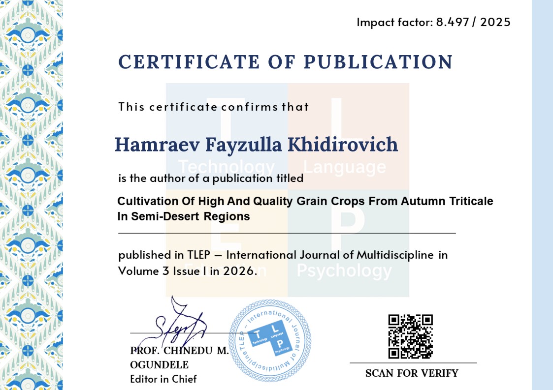 Кушматов Б.С. Экиш муддати, уруғ ва маъданли ўғитлар меъёрларини тритикаленинг дон ҳосилдорлиги ва сифатига таъсири // Тадқиқот ва инновациялар журнали, 1-жилд, 8-сон, 2023 йил. Б.59-66.