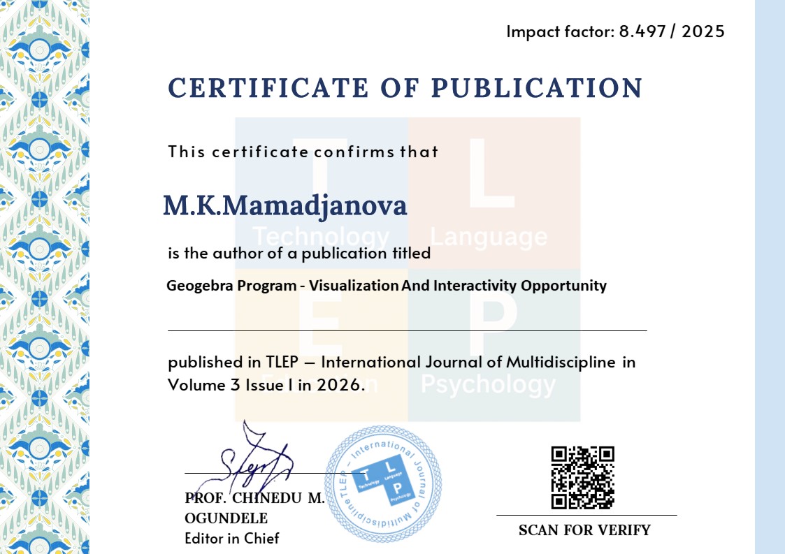 The article discusses the use of GeoGebra software mathematician in education role and his/her main opportunities analysis GeoGebra is a interactive and dynamic mathematician program is, she is geometry, algebra, calculation and statistics combined strong tool The article describes the use of GeoGebra software. to the user mathematician concepts visual in a way show opportunities, issues clear and fast solution to do opportunities, also, mathematician models in creation assistant functions is brought. Program to teachers and to students mathematics study and in teaching visualization, interactive experience and real time in mode analysis to do opportunities presented will reach.