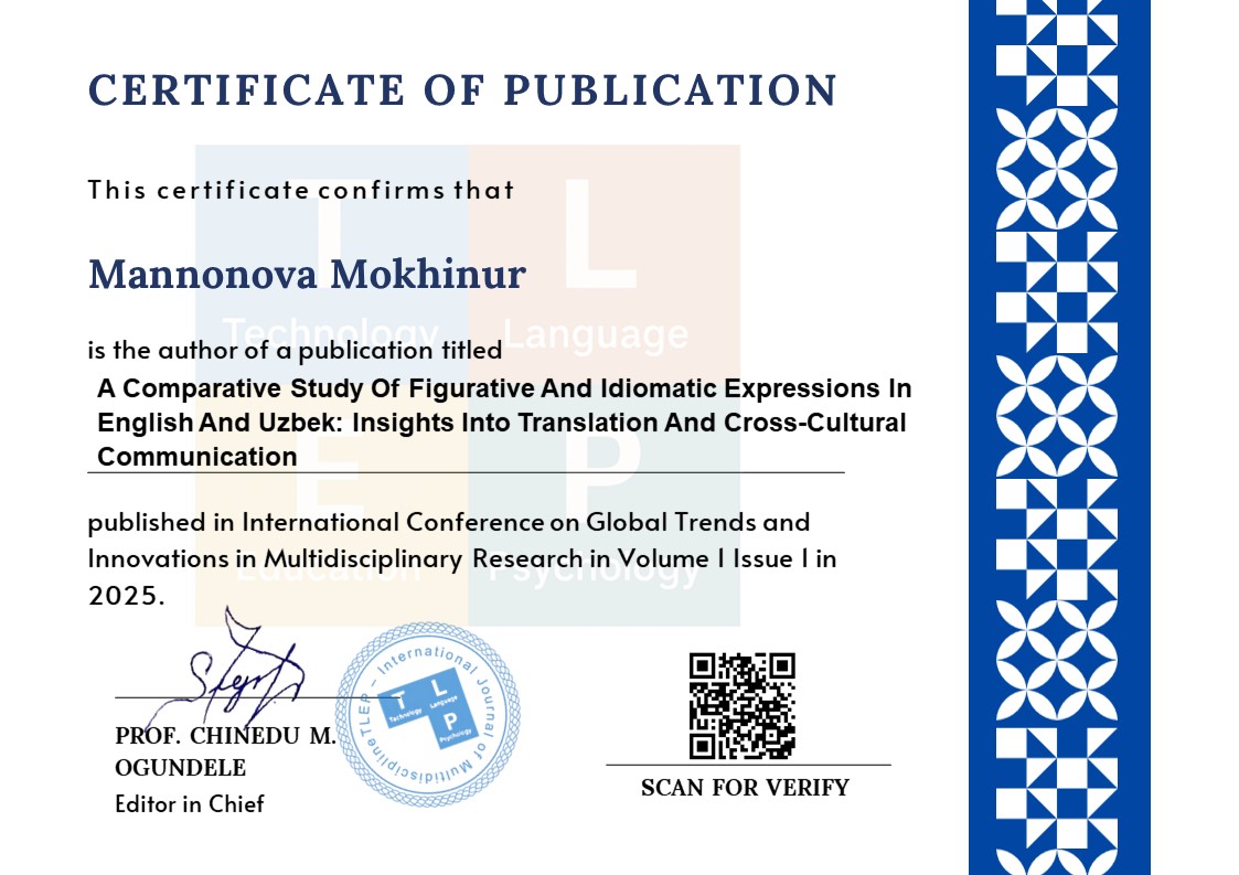 Kurbanova, G. (2022). *Idiomatic expressions in Uzbek and English: Comparative approach*. Tashkent State University Press.