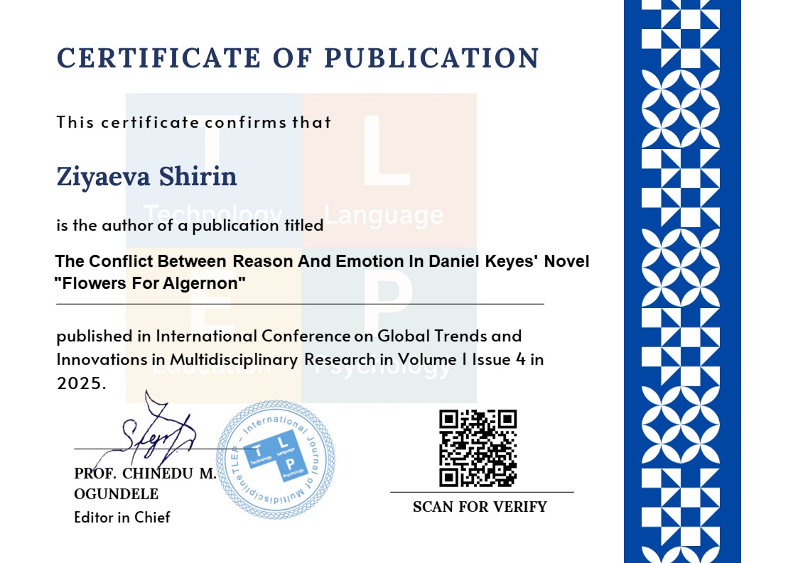 In world literature, works aimed at artistic analysis of the human psyche and thought processes occupy a special place. In 20th-century American literature, Daniel Keyes' novel "Flowers for Algernon" is one of such works. The author raises the most important questions of humanity through the artificially acquired intelligence of a simple worker, Charlie Gordon. The work reveals the imbalances that arise in the world of emotions, the pursuit of happiness and its tragic end, along with the expansion of human consciousness, based on deep psychological analysis.