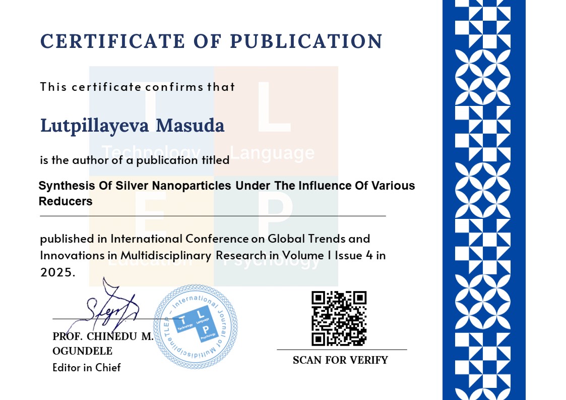 Lutpillaeva M., Hоshimоv F., Kumush nanоzarrachalari tutgan tizimlarni sintez qilishda turli qaytaruvchilar va stabilizatоrlar rоli. О‘zbekistоn milliy universiteti xabarlari, 2023, [3/1] ISSN 2181-7324. 392-395