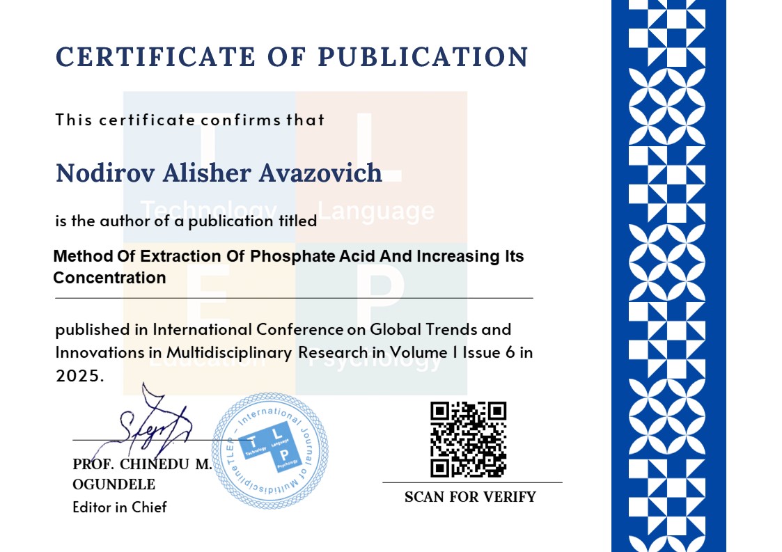 3.Nodirov A. A., Nozimov E. S., Azimjonov S. Extraction Phosphoric Acid From Washed Calcined Phosphorite Concentrate //TLEP–International Journal of Multidiscipline. – 2025. – Т. 2. – №. 4. – С. 284-286.