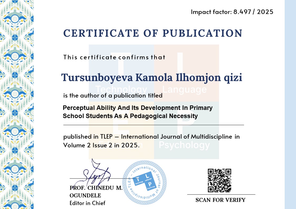 This article explores the psychological and pedagogical foundations of developing perceptual abilities in primary school students. Perceptual ability refers to the student’s capacity to accurately receive, interpret, and consciously analyze information from the external environment, and it plays a crucial role in shaping attention, observation, communication, and creative thinking during the learning process. The article emphasizes the importance of visual, auditory, analytical activities, and self-assessment methods in enhancing these skills.