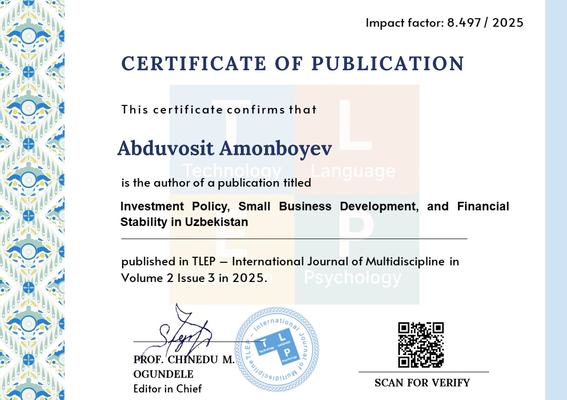 This paper examines how investment policy can contribute to financial stability in Uzbekistan, analyzing recent policy measures, macro-financial linkages, and the likely channels through which investment promotion and regulation affect systemic resilience. Employing a mixed-methods approach—policy-document analysis, secondary data synthesis, and comparative institutional evaluation—the study identifies strengths, vulnerabilities, and policy gaps that shape the interaction between investment flows and financial stability. Results highlight that while Uzbekistan’s investment liberalization and regulatory reforms have improved capital inflows and diversification, persistent governance, regulatory coordination, and macroprudential capacity gaps raise risks of sudden capital reversals, credit concentration, and asset-price pressures.