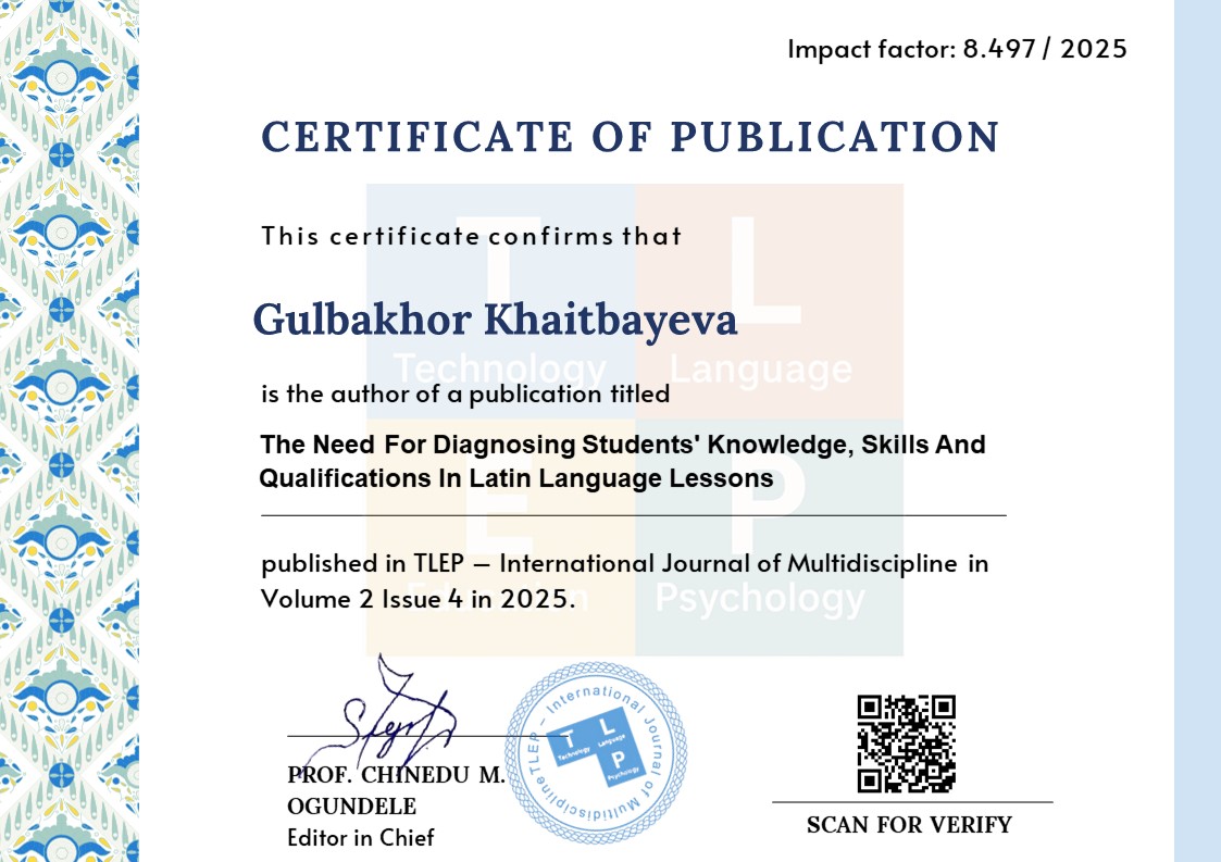 Khaitbayeva, G. (2025). The Need For Diagnosing Students’ Knowledge, Skills And Qualifications In Latin Language Lessons. TLEP – International Journal of Multidiscipline, 2(4), 135-137. https://www.tlepub.org/index.php/1/article/view/218