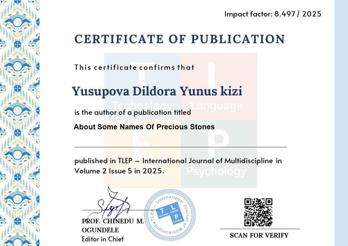 Radzhabova D. Lingvocognitive properties of names of precious stones and minerals in English and Uzbek languages: Diss. of Doctor of Philological Sciences. ‒ Bukhara, 2024. ‒ 170 p.