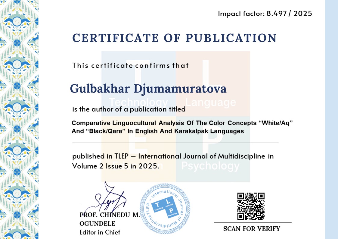 The article explores the conceptual, semantic, and cultural meanings of the color terms “white/aq” and “black/qara” in English and Karakalpak languages. Within the framework of cognitive linguistics and linguoculturology, color terms are analyzed as key components of ethnic worldview and mental representation. The study reveals both universal and nationally specific semantic and symbolic values of these colors, showing that while white and black function as universal opposites across cultures, their cultural interpretations reflect deep variations in moral, aesthetic, and spiritual perception.