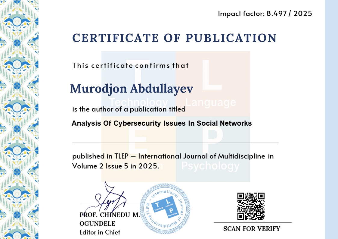 Jalilov A. “Ijtimoiy tarmoqlarda axborot xavfsizligi muammolari”. Axborot texnologiyalari jurnali, 2023.