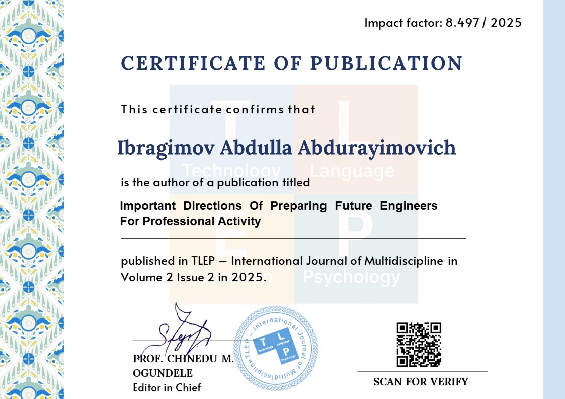 Azizov Z. (2021). “Bo‘lajak muhandislarning raqamli kompetensiyasini rivojlantirish yo‘llari”. Ilmiy amaliy jurnal: Kasb-hunar ta’limi.
