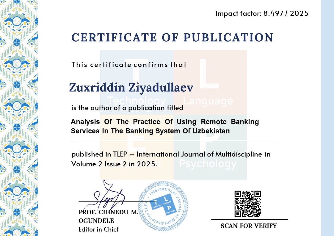 Mamadiyarov Z.T. Legal basis for the development of remote banking services // Priority areas of development of the financial sector in Uzbekistan. Collection of materials of the Republican scientific and practical conference. TDIU, November 10, 2017, pp. 330-333.