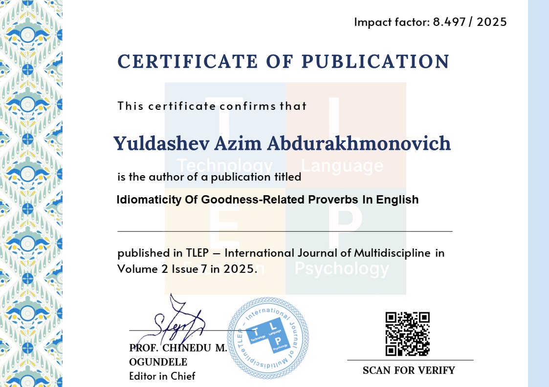 This article investigates the semantic motivation and degree of idiomaticity of English proverbs expressing the concept of goodness. Proverbs are examined as culturally marked phraseological units that encode moral values through figurative language and stable semantic structures. Drawing on A. V. Kunin’s theory of phraseological units, the study differentiates goodness-related proverbs according to degrees of idiomaticity, including phraseomatic, ideophraseomatic, and fully idiomatic types. The analysis also incorporates conceptual metaphor theory to identify cognitive mechanisms underlying semantic motivation. The data are taken from authoritative English proverb dictionaries and verified lexicographic sources. The findings demonstrate that English proverbs expressing goodness are predominantly metaphorically motivated and exhibit varying degrees of semantic transparency, reflecting ethical norms such as reciprocity, altruism, and moral causality. The study contributes to phraseological semantics by clarifying the applicability of idiomaticity and motivation frameworks to proverbial material.