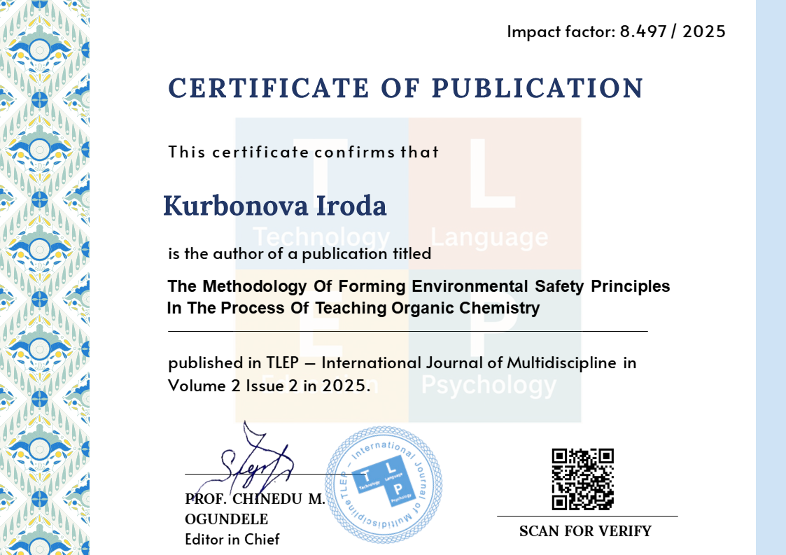 Abdullayeva, N.R., & Tursunov, B.S. (2021). Methodologies for Ensuring Environmental Safety in Organic Chemistry. Tashkent: Uzbekistan State Pedagogical University Publishing.