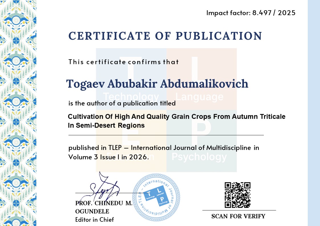 Кушматов Б.С. Экиш муддати, уруғ ва маъданли ўғитлар меъёрларини тритикаленинг дон ҳосилдорлиги ва сифатига таъсири // Тадқиқот ва инновациялар журнали, 1-жилд, 8-сон, 2023 йил. Б.59-66.