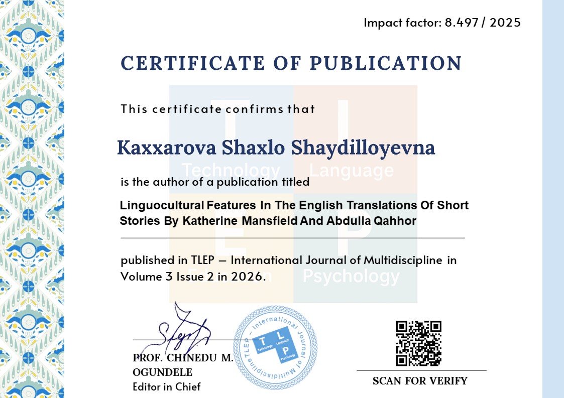 This article explores the linguocultural features reflected in the English translations of short stories by Katherine Mansfield and Abdulla Qahhor. As representatives of different national literatures and cultural environments, both writers vividly portray their societies through language, imagery, cultural symbols, and social realities. The study focuses on how culturally specific elements, national mentality, everyday life, traditions, and value systems are expressed and preserved in translation. Particular attention is given to the challenges of translating culture-bound expressions, realia, phraseological units, and implicit meanings. The research applies comparative, descriptive, and linguocultural analysis methods to examine the degree to which cultural identity is conveyed in translated texts. The findings reveal that successful translation requires not only linguistic competence but also deep cultural awareness, as linguocultural units often carry national worldviews and collective memory. The article emphasizes that translation serves as a bridge between cultures and plays a crucial role in intercultural communication.
