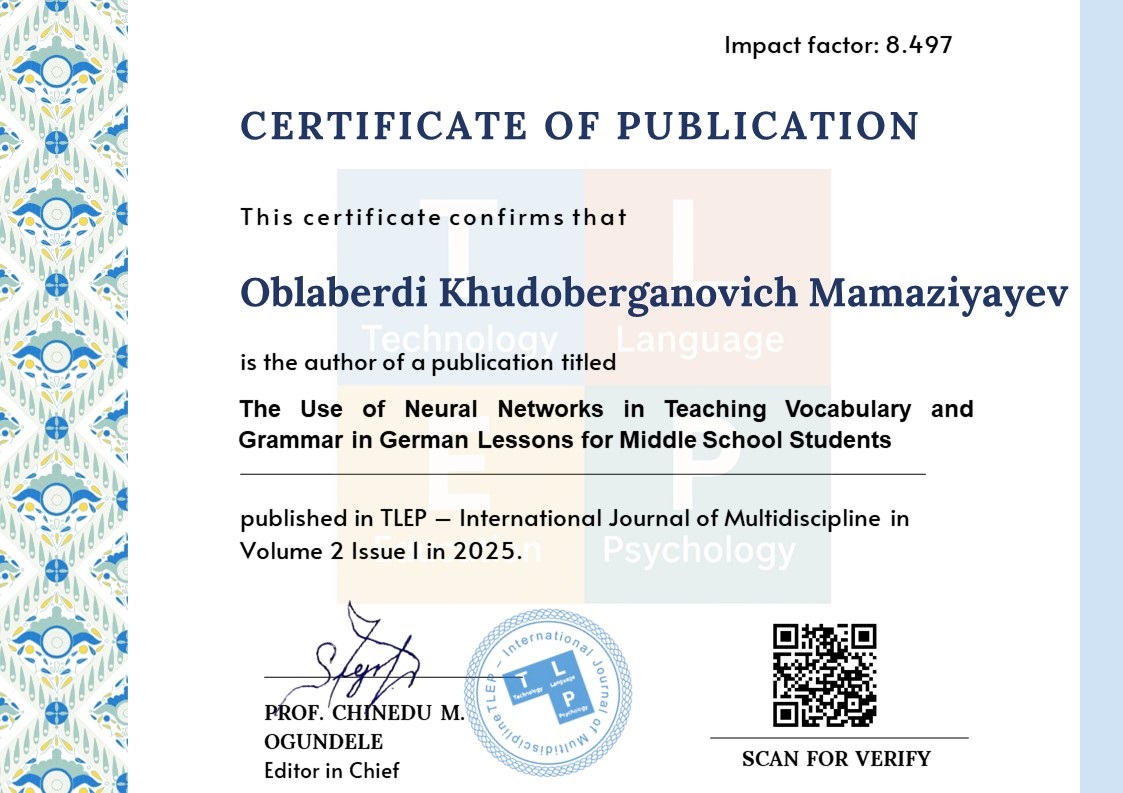 artificial intelligence, neural networks, German language education, vocabulary teaching, grammar, digital education.Abstract