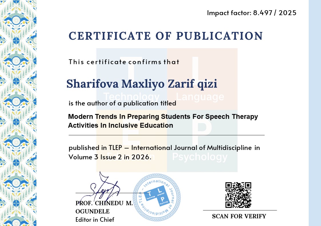 inclusive education, speech therapy training, modern pedagogical trends, digital competence, correctional pedagogy, early childhood intervention, future speech therapists, higher education methodologies, interactive technologies.Abstract