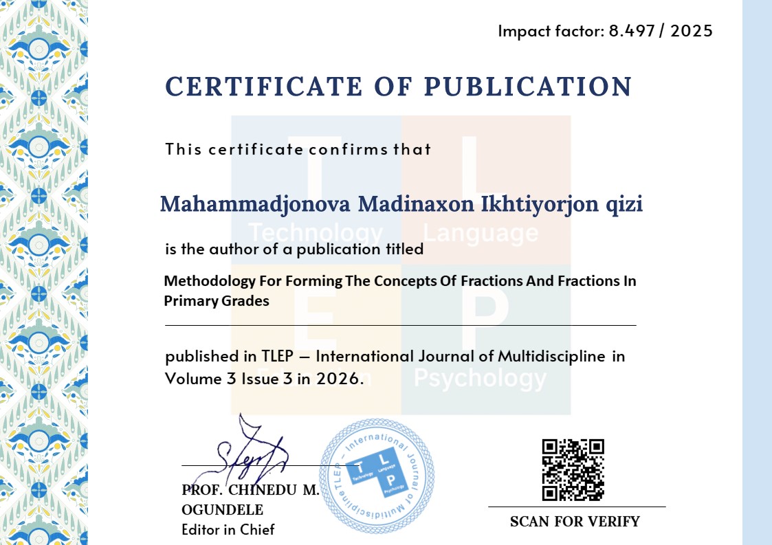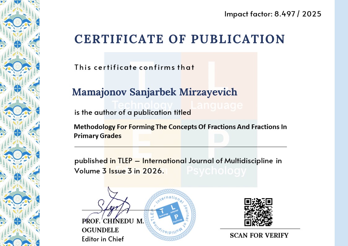 Berdiyev, B. R., & Nortojiyeva, M. Z. (2025). Ulush va kasr tushunchasini o‘rgatishda ko‘rgazmali qurollardan foydalanish: oddiy kasrlarning taqqoslash va bir xil maxrajli kasrlarni qo‘shish va ayirishni o‘rgatish. Scientific Theoretical and Methodical Journal “INTER EDUCATION & GLOBAL STUDY”, (3). ISSN 2992 9024 (online).