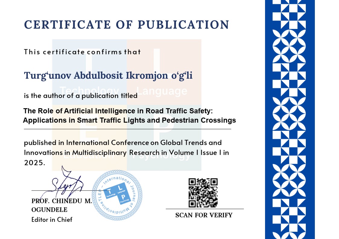 This thesis explores the growing use of artificial intelligence (AI) technologies in improving road traffic safety, with a particular focus on their application in smart traffic lights and pedestrian crossings. Drawing on international experiences from the United States, China, Japan, and Europe, as well as recent pilot projects in Uzbekistan, the study highlights the potential of AI to reduce traffic congestion, prevent accidents, and enhance pedestrian safety. The research methodology includes analysis of academic literature, review of international case studies, and examination of the latest developments in AI-powered traffic management systems during 2023–2025.