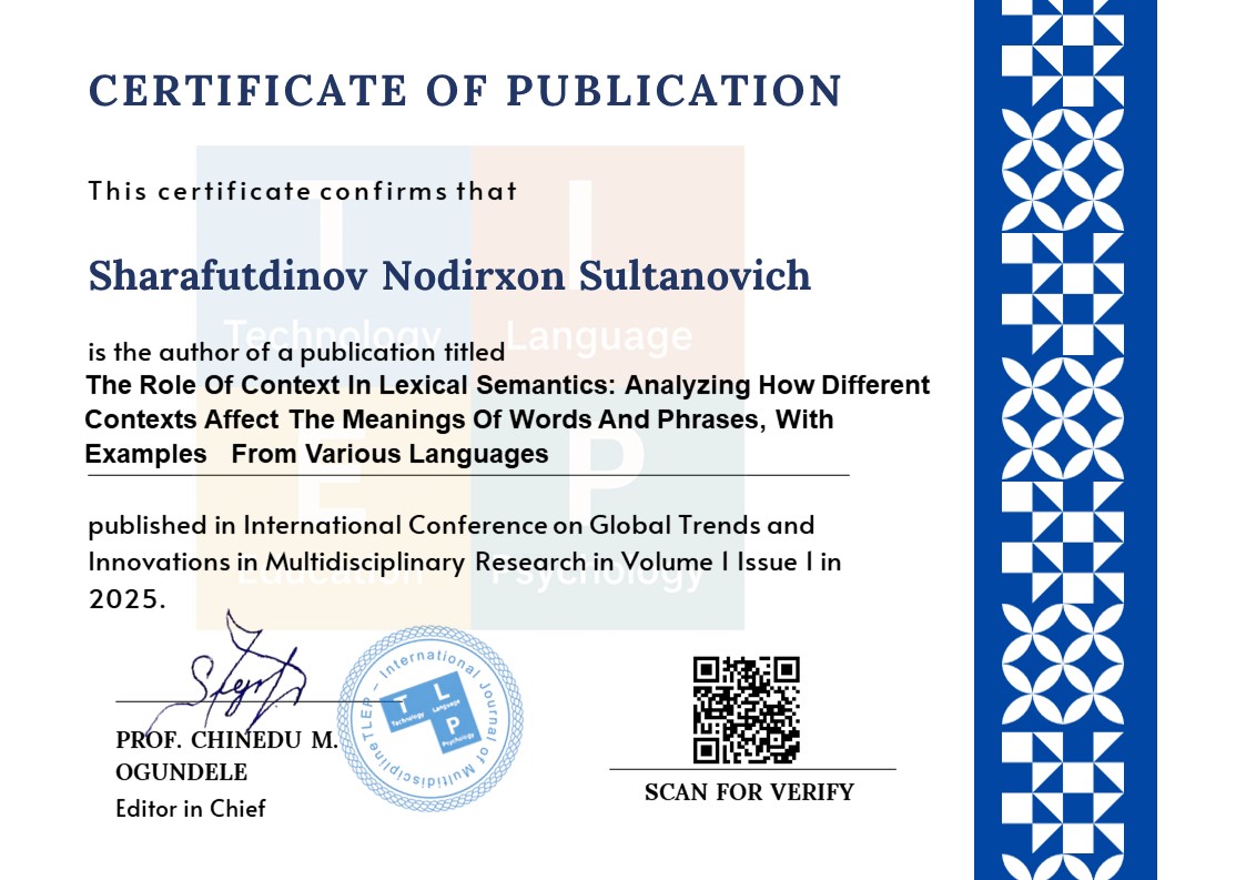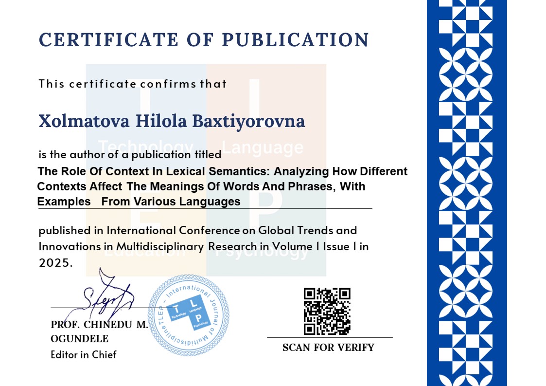 The study of lexical semantics, a subfield of linguistics that looks at word meanings and how context affects interpretation, is examined in this article. To illustrate how words carry meaning and change depending on linguistic, cultural, and situational settings, it offers a thorough examination of several important theoretical frameworks, including componential analysis, prototype theory, frame semantics, and distributional semantics. Cross-linguistic research between Uzbek and English reveals both language-specific and universal patterns in semantic interpretation, especially with regard to politeness tactics, idiomatic phrases, and polysemy. With an emphasis on the need of semantic shifts for language acquisition, natural language processing (NLP), and intercultural communication, the challenges in contextual analysis and machine translation are also covered in the study; a comparative approach is adopted, so contributing to a more comprehensive knowledge of how meaning is constructed, interpreted, and changed across languages and contexts.