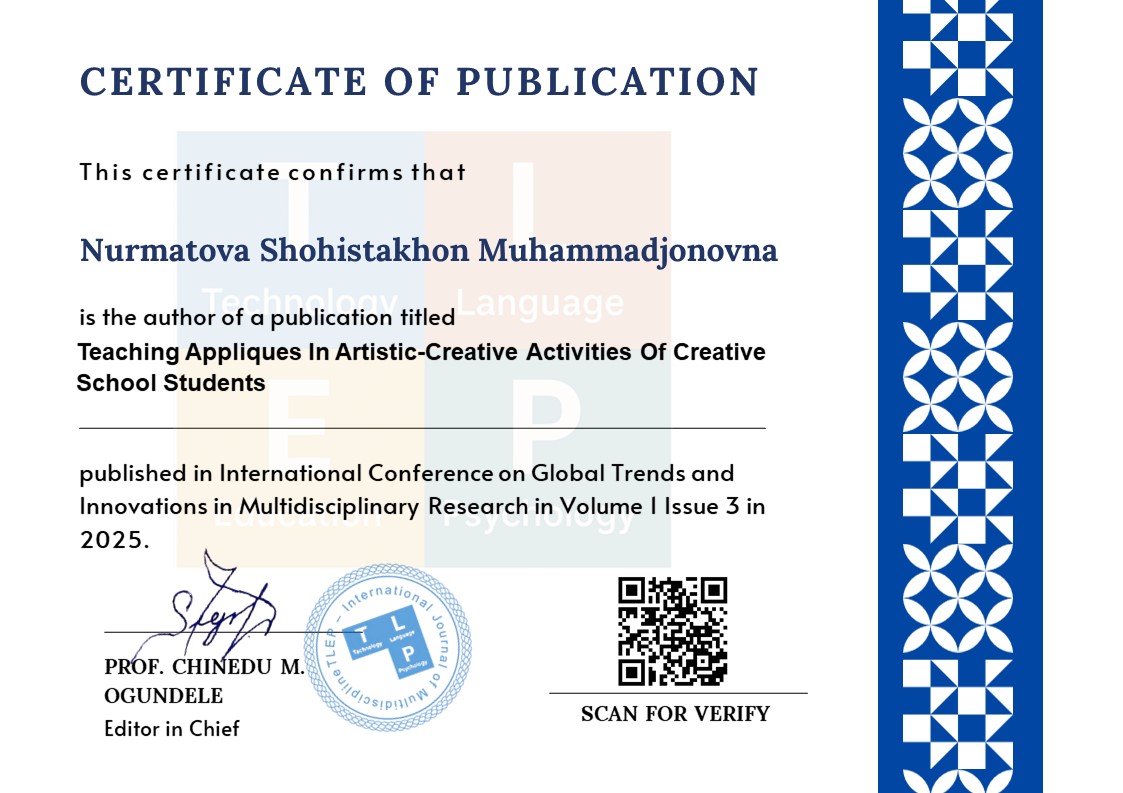 Teaching applique requires familiarization with the material, mastering the skills of cutting out various shapes, placing them in a certain order, and gluing them in a way that suits the image and subject. Teaching applique is based on developing the process of children's perception. This article provides information on the concept of applique, its types and its importance in developing artistic and creative competence in creative school students based on a creative approach.
