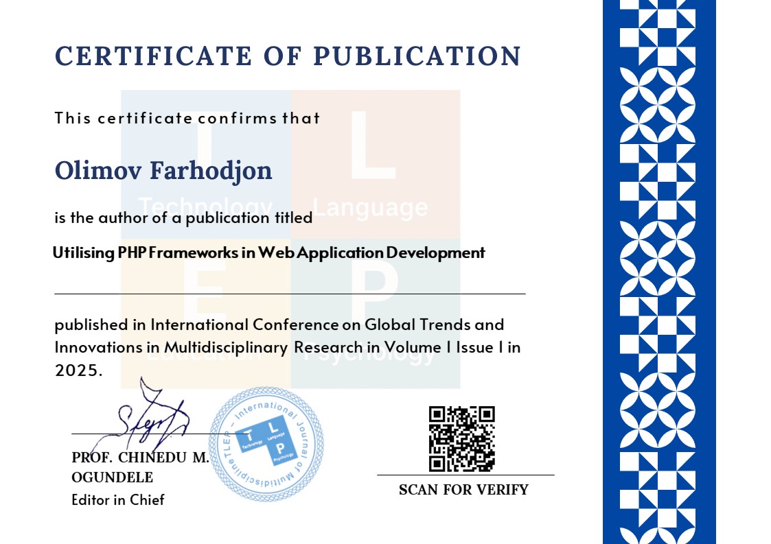 This article explores the significance of PHP frameworks in modern web application development, their architecture, security features, development process, and future trends. It emphasises how developers can build complex and scalable web applications efficiently and securely using PHP frameworks. It also presents a scientific perspective on the key advantages of frameworks, their modular software structure, built-in security mechanisms, and integration with modern technologies.
