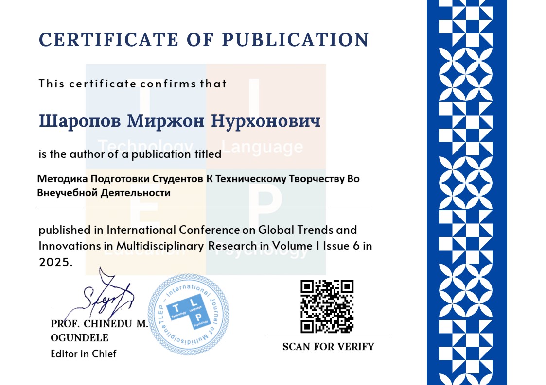 Sharopov M. N. O., Sanakulov H. K. Directions for Developing Technical Thinking in Future Teachers //International Journal of Formal Education. – 2024. – Т. 3. – №. 7. – С. 59-67.