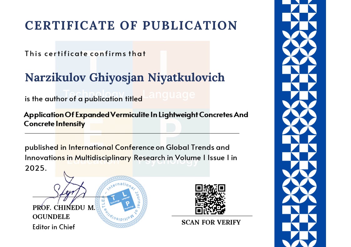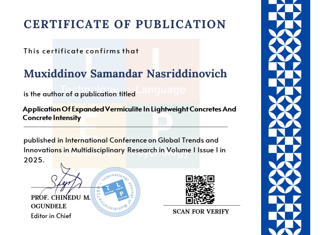 Akramov XA, Tursunov BA " Use of lightweight concrete based on local vermiculite in construction " Ministry of the Russian Federation.
